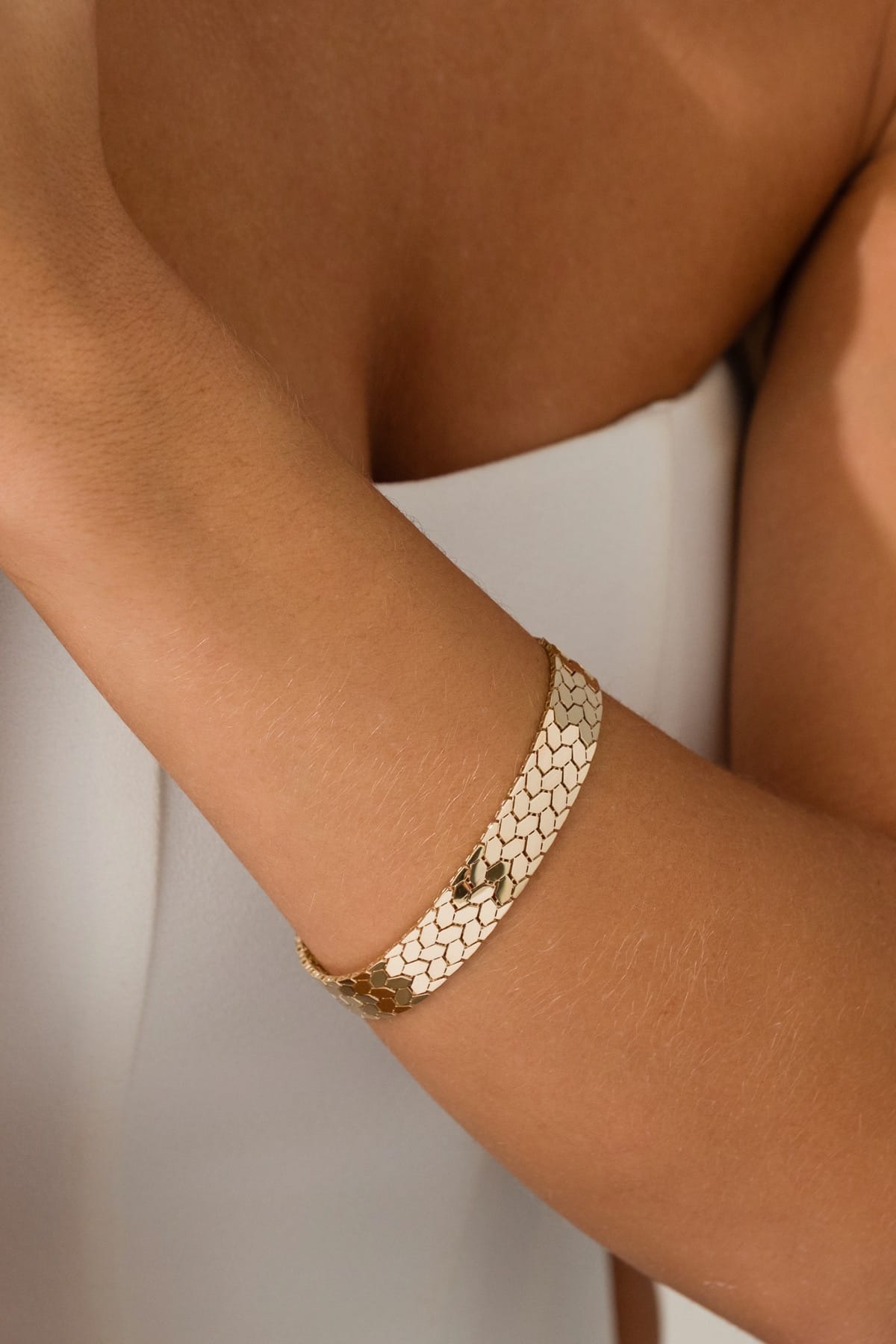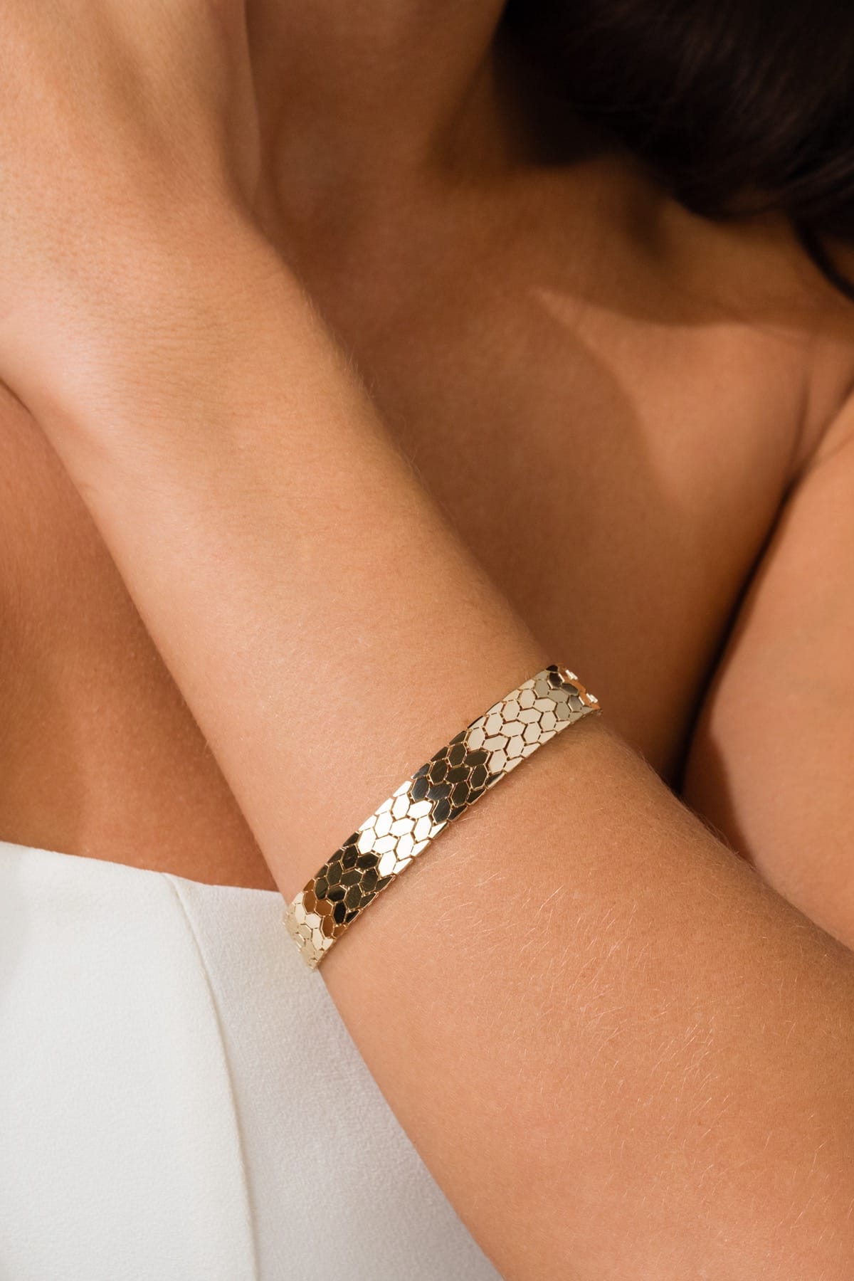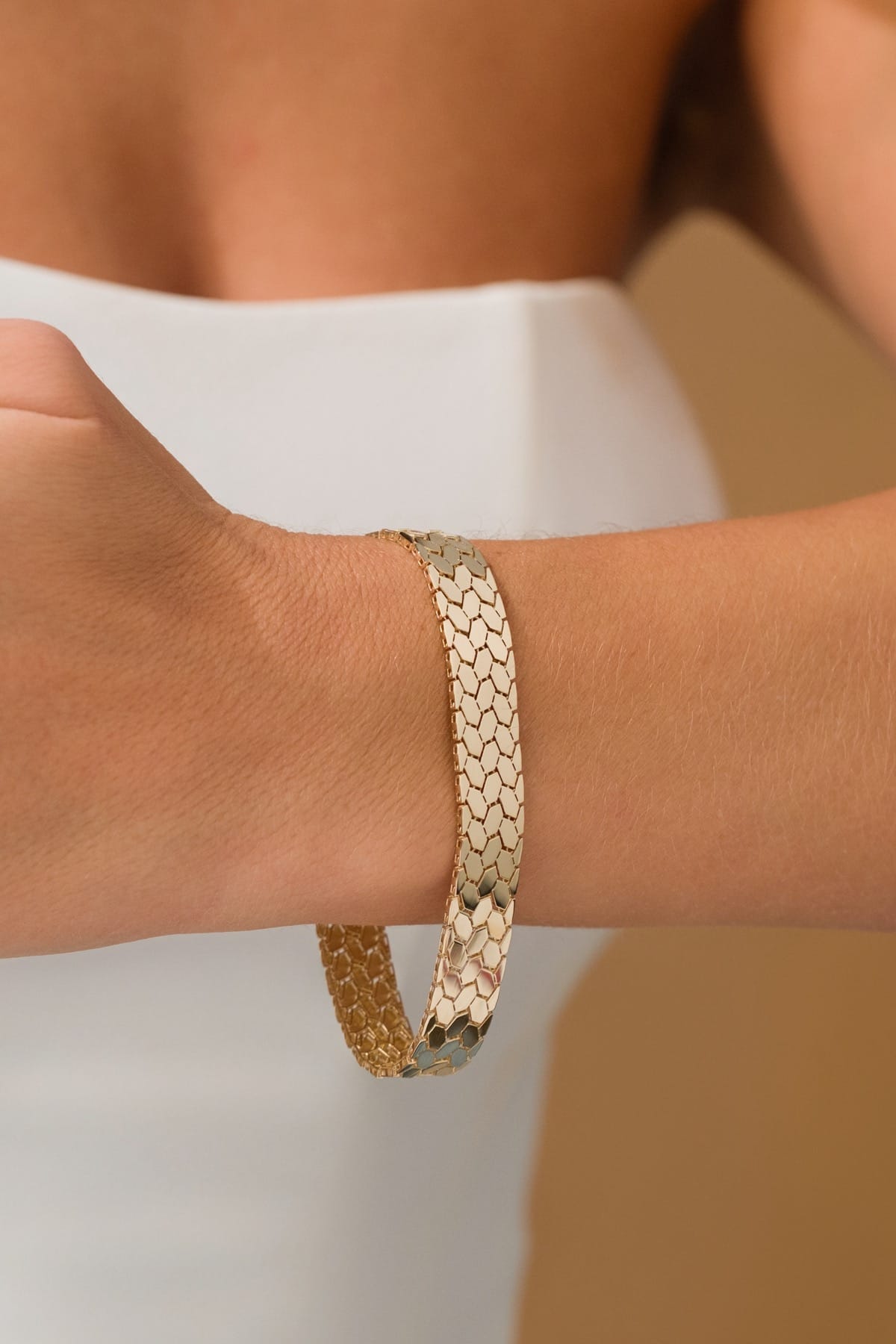 Bu şık ve zarif bileklik , 14 ayar (585k) altından üretilmiştir. Ürün üzerinde ayar damgası ve üretici patenti yer almaktadır. Günlük kullanım için ideal olup, zarif tasarımıyla her stile uyum sağlar.